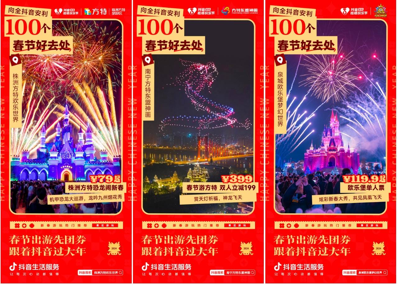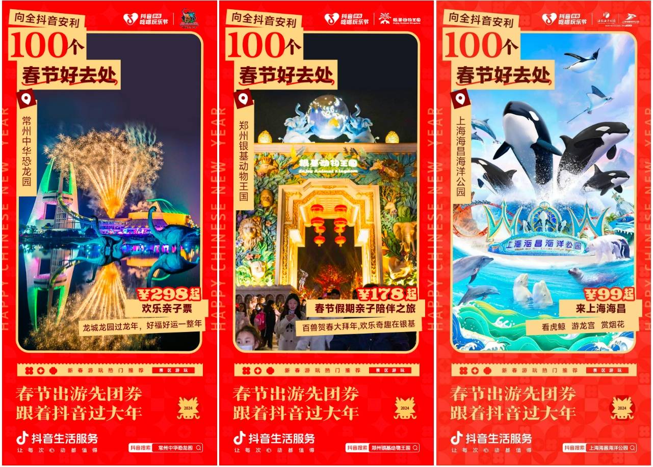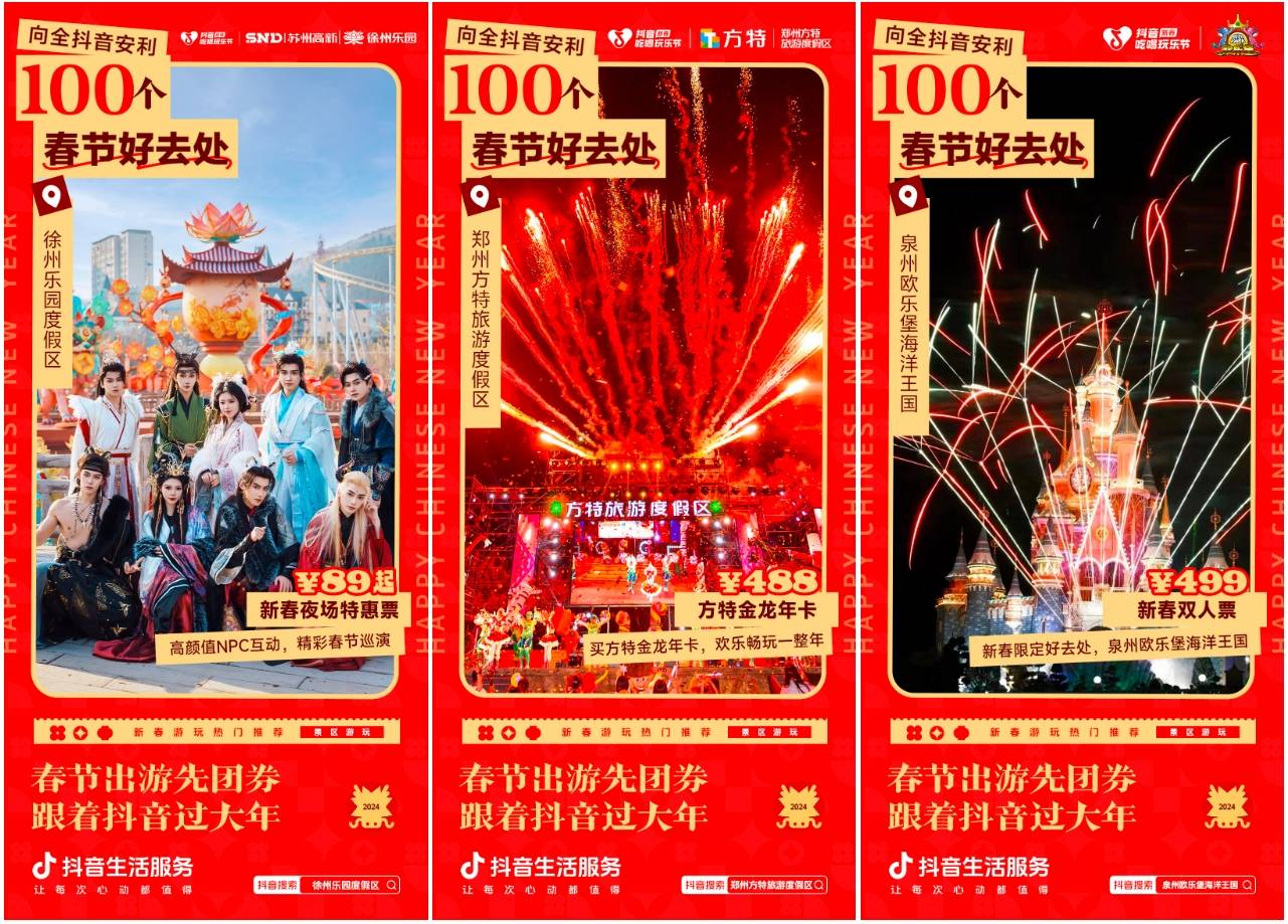 2月6日至2月8日,抖音生活服务在#新春吃喝玩乐节 活动中,联动众多景区乐园与度假商家,开启“返乡出行日”主题活动,探索春节生意密码。多种优惠福利惊喜上线,让用户龙年行龙运,度过难以忘怀的春节假期!