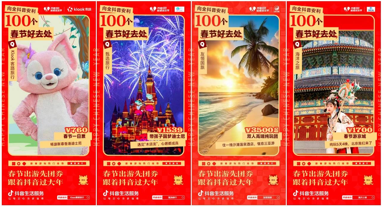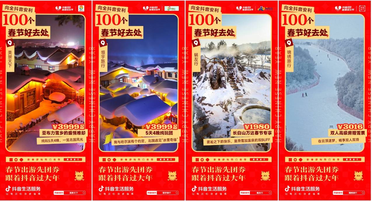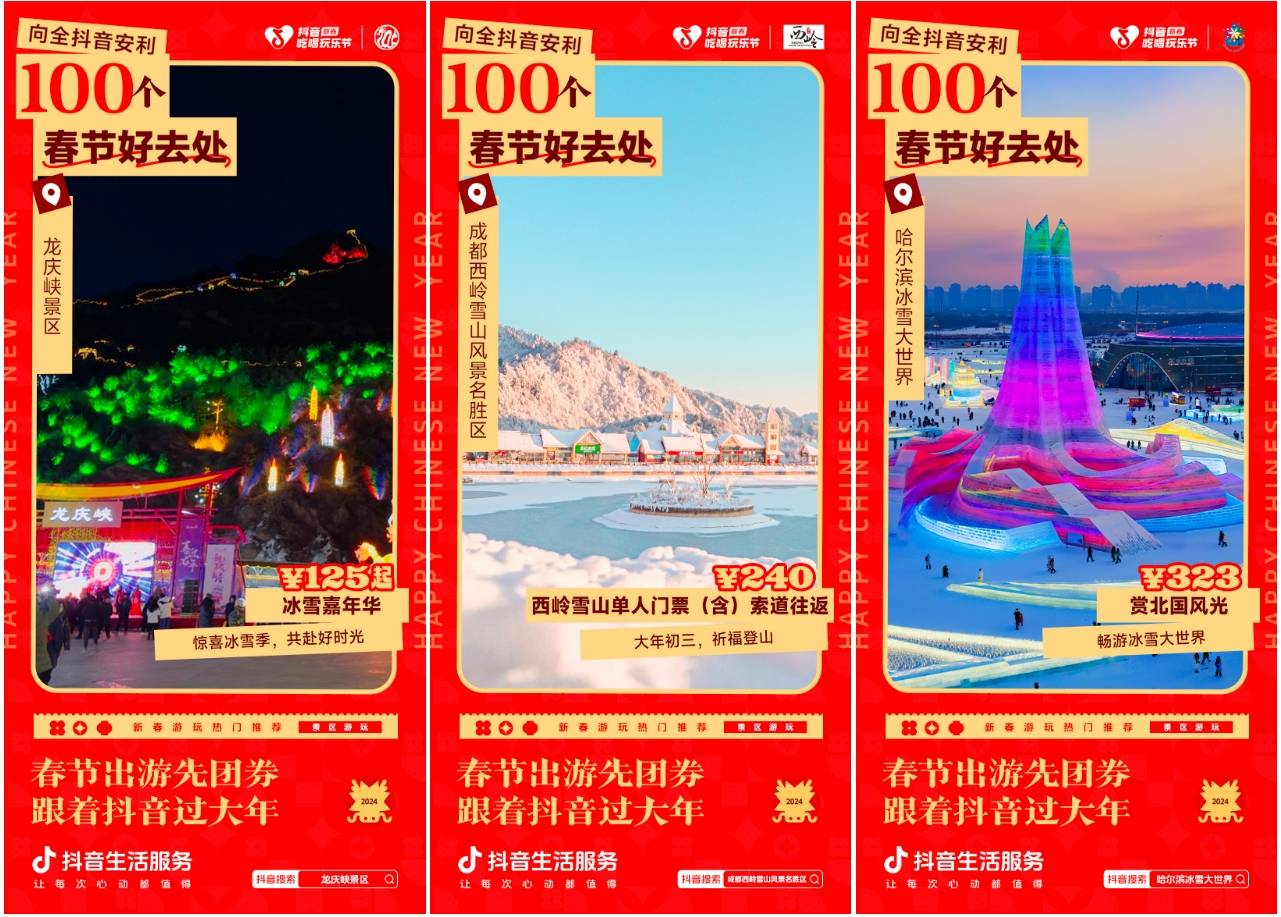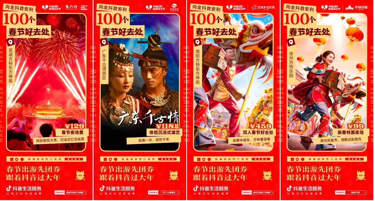2月6日至2月8日,抖音生活服务在#新春吃喝玩乐节 活动中,联动众多景区乐园与度假商家,开启“返乡出行日”主题活动,探索春节生意密码。多种优惠福利惊喜上线,让用户龙年行龙运,度过难以忘怀的春节假期!